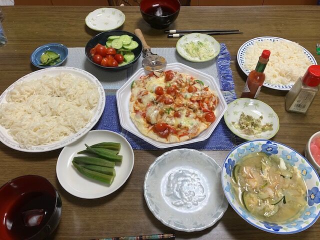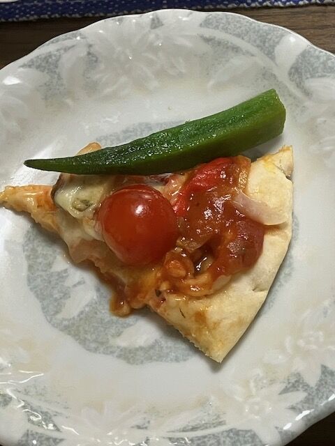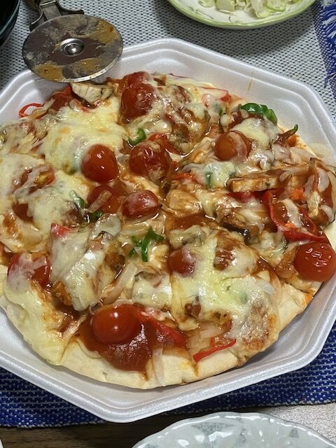 いつものように市販の300円のマルゲリータに、トマトや玉ねぎ、ピーマン、舞茸、ピザソース、チーズを載せてオーブントースターで焼きました。