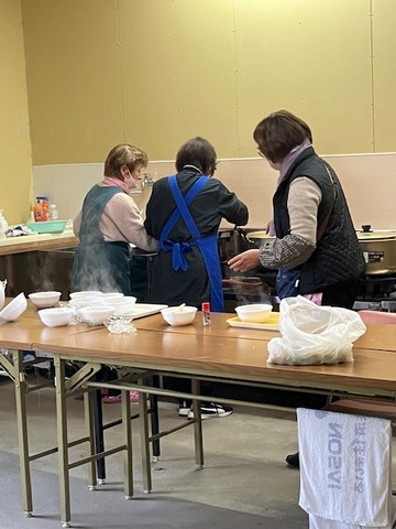 ボランティアの方々がけんちん汁や甘酒を用意してくれています。