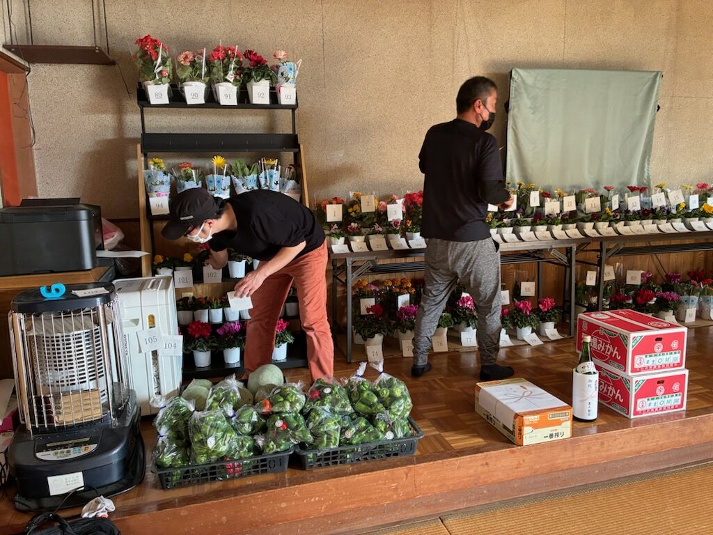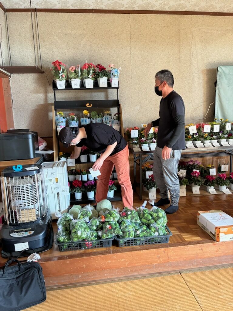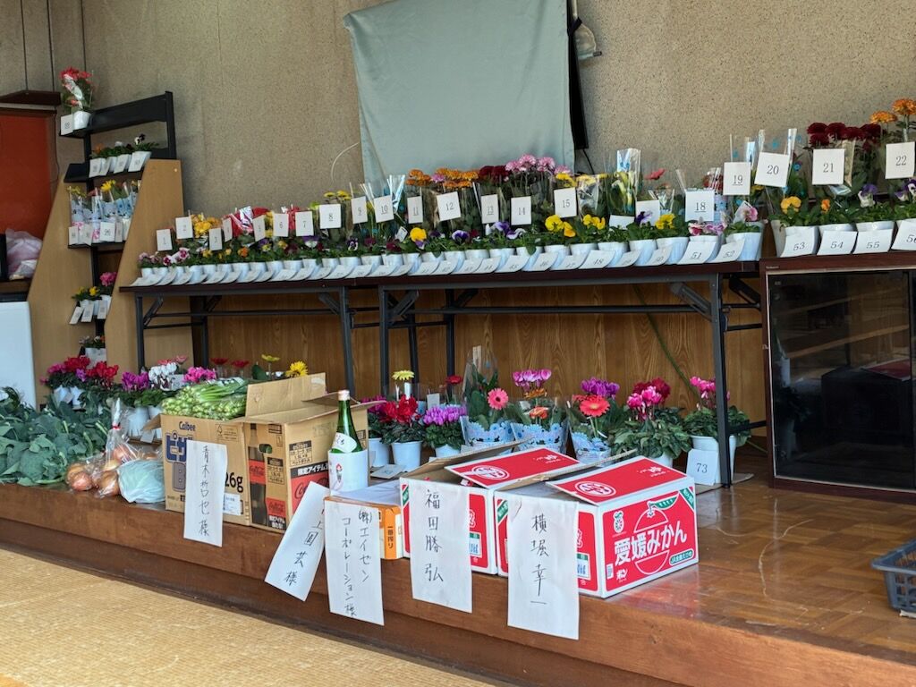 農家の方から、ピーマンや小松菜、カボチャ、ブロッコリー、玉ねぎ、キャベツ、みかん、日本酒、ビールなどを寄付していただきました。