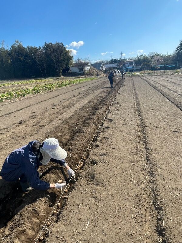 クワで深さ10cmほどの溝を掘り、そこにジャガイモを植え付けます。